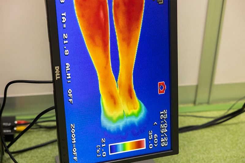 温度が低い箇所は青く、高い箇所は赤く表示され、靴下着用による影響や時間経過による温度変化などを視覚的に記録することができます。