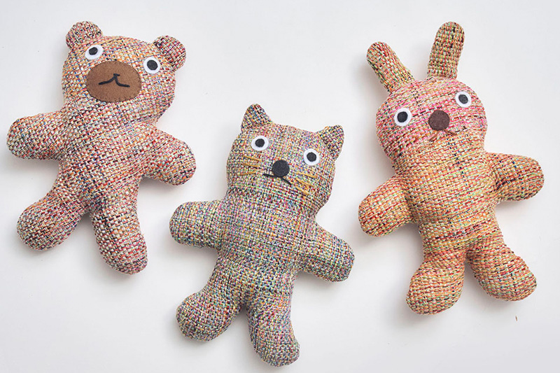 靴下製造工場で出る残糸を使い、糸から手織りで生地を紡ぎ、ぬいぐるみへと仕立てていきます。